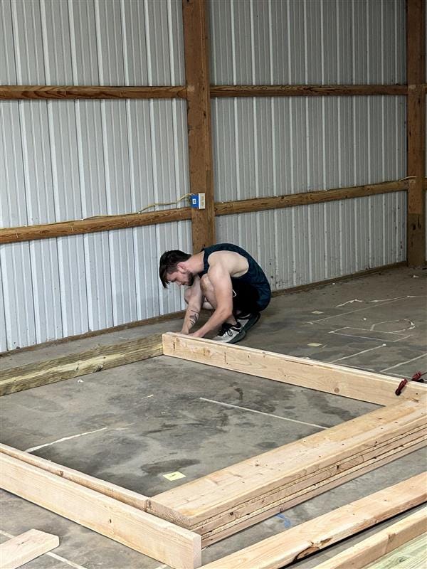 Sunday, I found myself on the floor in dirty shorts, learning how to frame a wall.